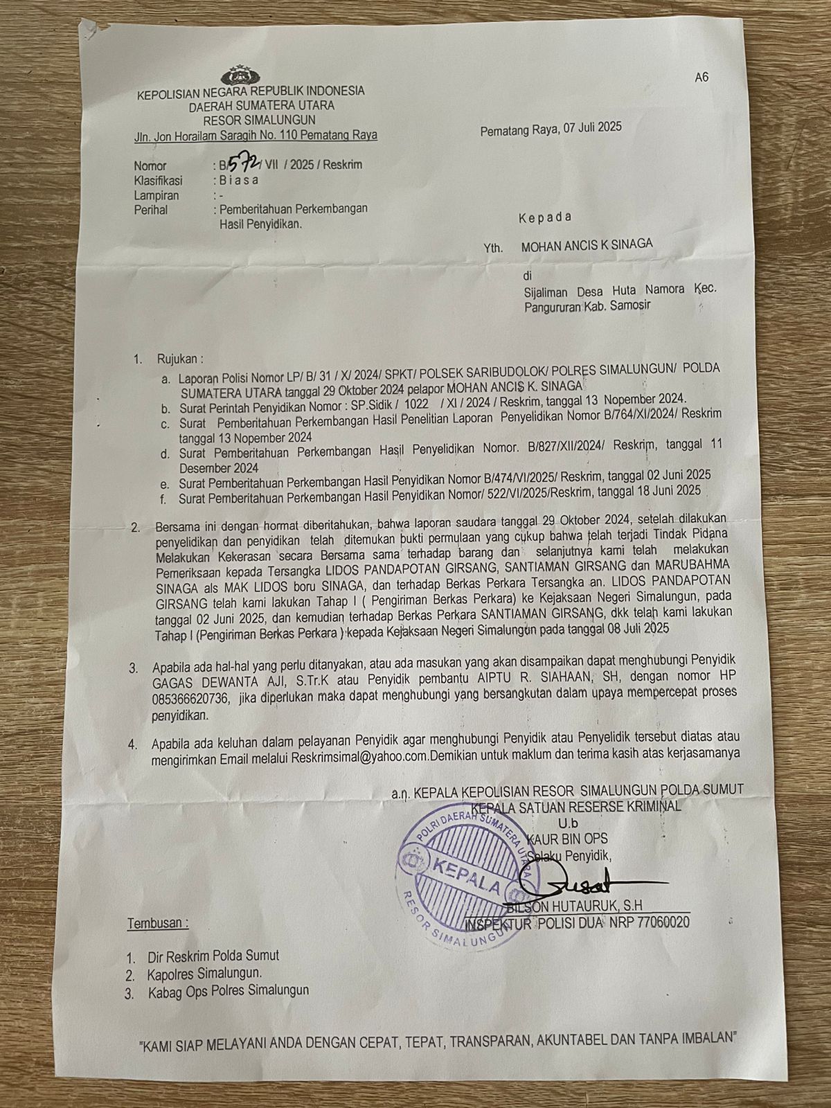 Dalam SP2HP (Surat Pemberitahuan Perkembangan Hasil Penyidikan) terakhir tertanggal 7 Juli 2025 yang diterima pelapor, penyidik menyebutkan bahwa berkas Lidos sudah diserahkan ke kejaksaan sejak 2 Juni 2025, sementara Santiaman Girsang pada 7 Juli 2025. Namun, tidak ada satupun tindakan penahanan terhadap para tersangka lainnya, termasuk Marubahan br Sinaga yang tak lain adalah ibu kandung Lidos sendiri, serta 10 orang lainnya yang disebut-sebut turut terlibat dalam aksi brutal tersebut.