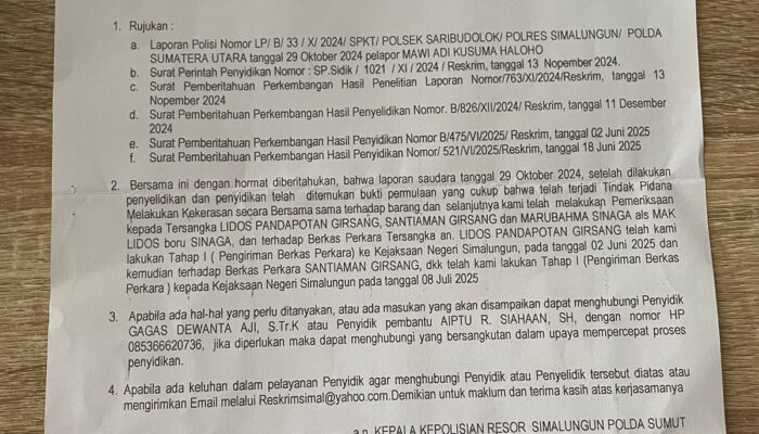 Bossmudanews.com , Simalungun — Penegakan hukum oleh Polres Simalungun kembali menjadi sorotan tajam publik. Meski Lidos Pandopaton Girsang telah divonis lima tahun penjara dalam perkara percobaan pembunuhan yang berkaitan langsung dengan laporan pengerusakan rumah dan kekerasan terhadap Mohan Ancis K. Sinaga, penyidik Polres Simalungun justru terkesan abai dan lamban dalam menindak para tersangka lainnya. Padahal, mereka telah berstatus tersangka sejak Desember 2024.
