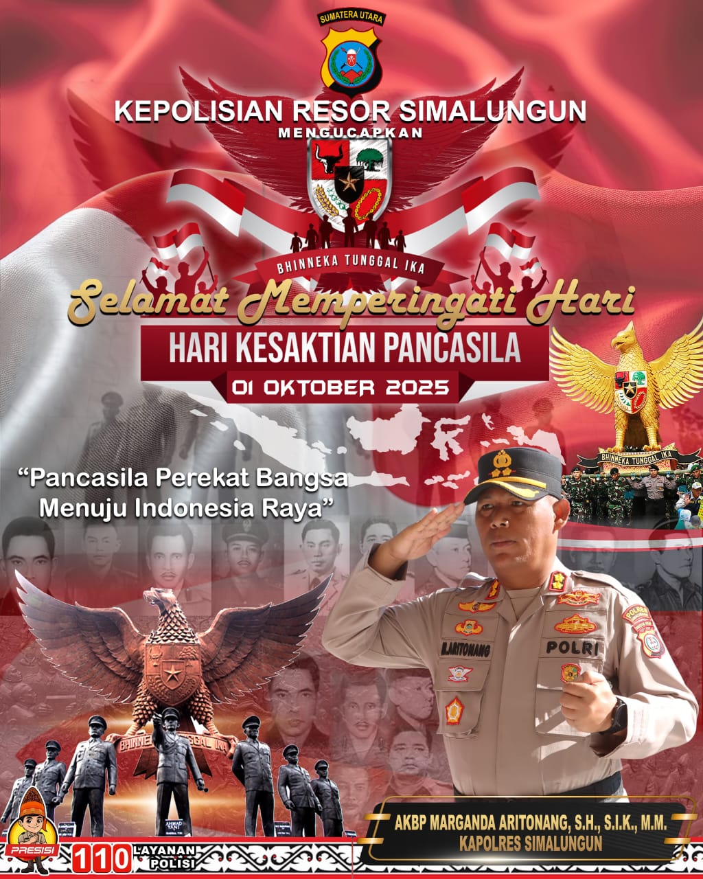 Kapolres Simalungun, AKBP Marganda Aritonang, S.H., S.I.K., M.M., didampingi istri tercinta, Ny. Nanik M. Aritonang, menyampaikan ucapan selamat memperingati Hari Kesaktian Pancasila kepada seluruh masyarakat Indonesia, khususnya warga Kabupaten Simalungun. Saat dikonfirmasi pada hari Rabu, 1 Oktober 2025, sekitar pukul 15.00 WIB, Kapolres menegaskan pentingnya menjaga persatuan dan kesatuan bangsa di tengah dinamika kehidupan berbangsa dan bernegara.